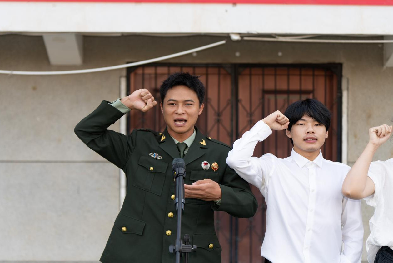 退役复学学生、2023级电气工程及其自动化01班闫义鑫以“反诈宣传大使”身份领誓:“擦亮双眼,不贪不信;严守信息,不点不转;遇事冷静,互助互警;护心防诈,共筑平安!”誓言声震云霄,展现了青年学子筑牢安全防线的坚定决心。