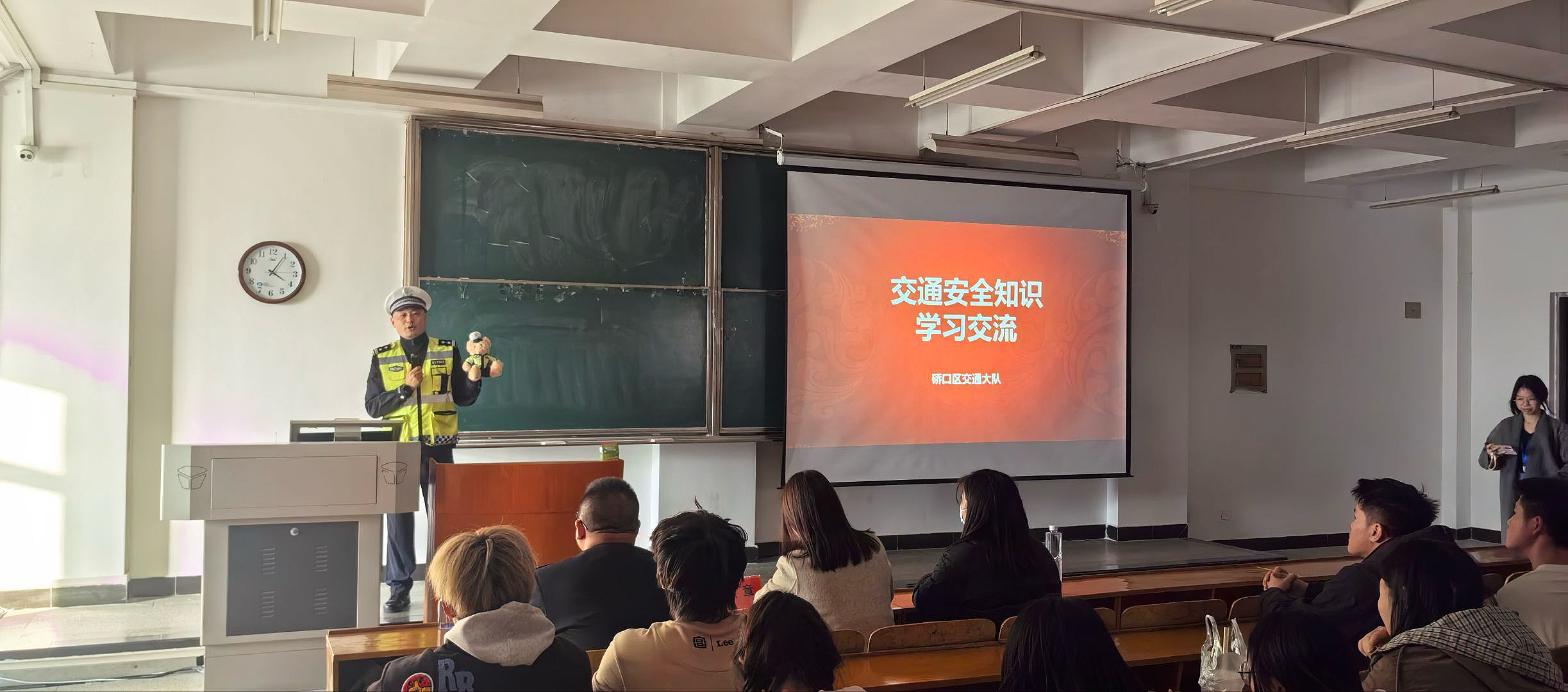 讲座伊始,杜警官以典型交通事故案例为切入点,通过深入剖析事故成因与后果,揭示了校园内容易被忽视的交通安全隐患。他结合高校出行特点,系统讲解了行人、非机动车及机动车在校园内的通行规范与安全准则。针对校园内电动自行车数量增多的情况,杜警官详细阐述了电动自行车骑行的规范要求,并结合近期发生的交通事故案例,深刻阐述了违反交通规则可能带来的严重后果,为在场师生敲响了安全警钟。“交通事故的发生不仅会造成身体伤害,还可能断送美好的前程。”杜警官表示,大学生作为社会的栋梁,更应当成为遵守交通规则的模范。他还提醒师生在通过学校门口的十字路口时要做到“一停二看三通过”,确保安全后再通行。