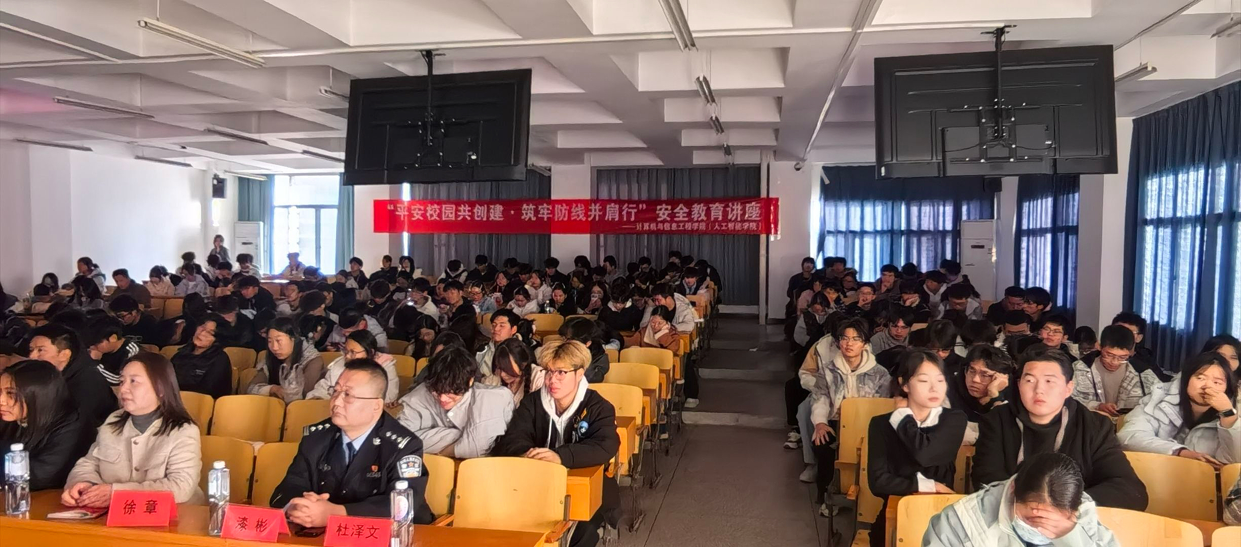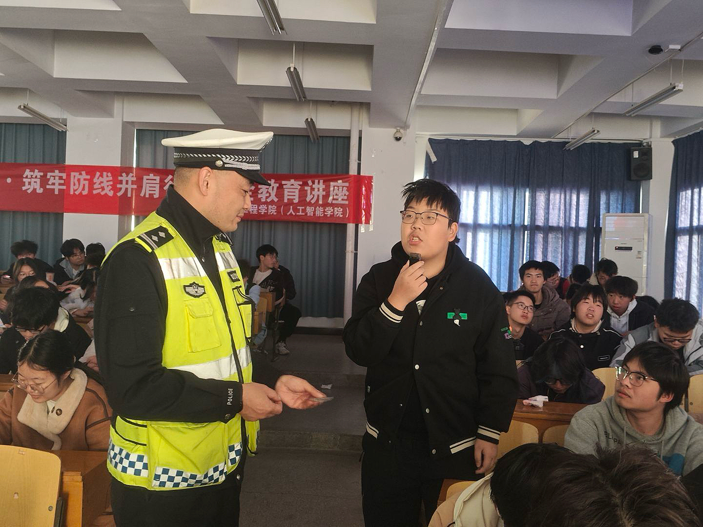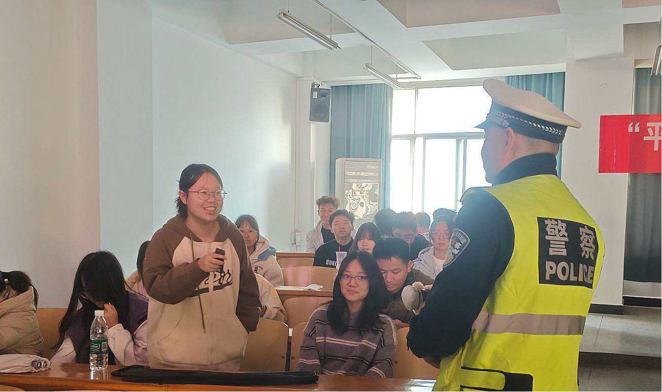 在随后的互动问答环节,同学们积极响应、踊跃参与,现场气氛热烈。杜警官提出多个交通安全知识问题,同学们争相回答,展现了扎实的交通安全知识储备。杜警官对同学们的发言给予充分肯定,并为回答正确的同学赠送了交通安全主题钥匙扣、小熊等纪念品,在轻松愉快的氛围中进一步巩固了所学知识。“这种寓教于乐的方式很棒,让我对交通安全知识有了更深刻的理解。”2025计算机科学与技术(华为认证工程师)01班的曹政康同学表示,“我会把今天学到的知识分享给更多的同学,做文明交通的宣传者”。