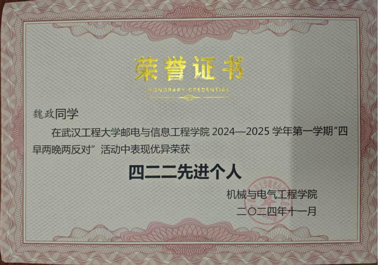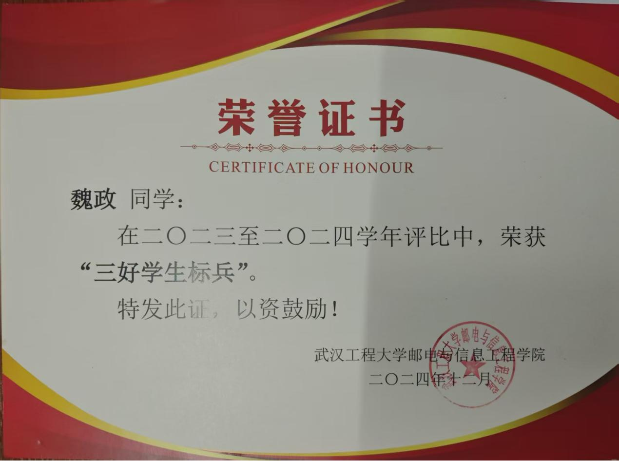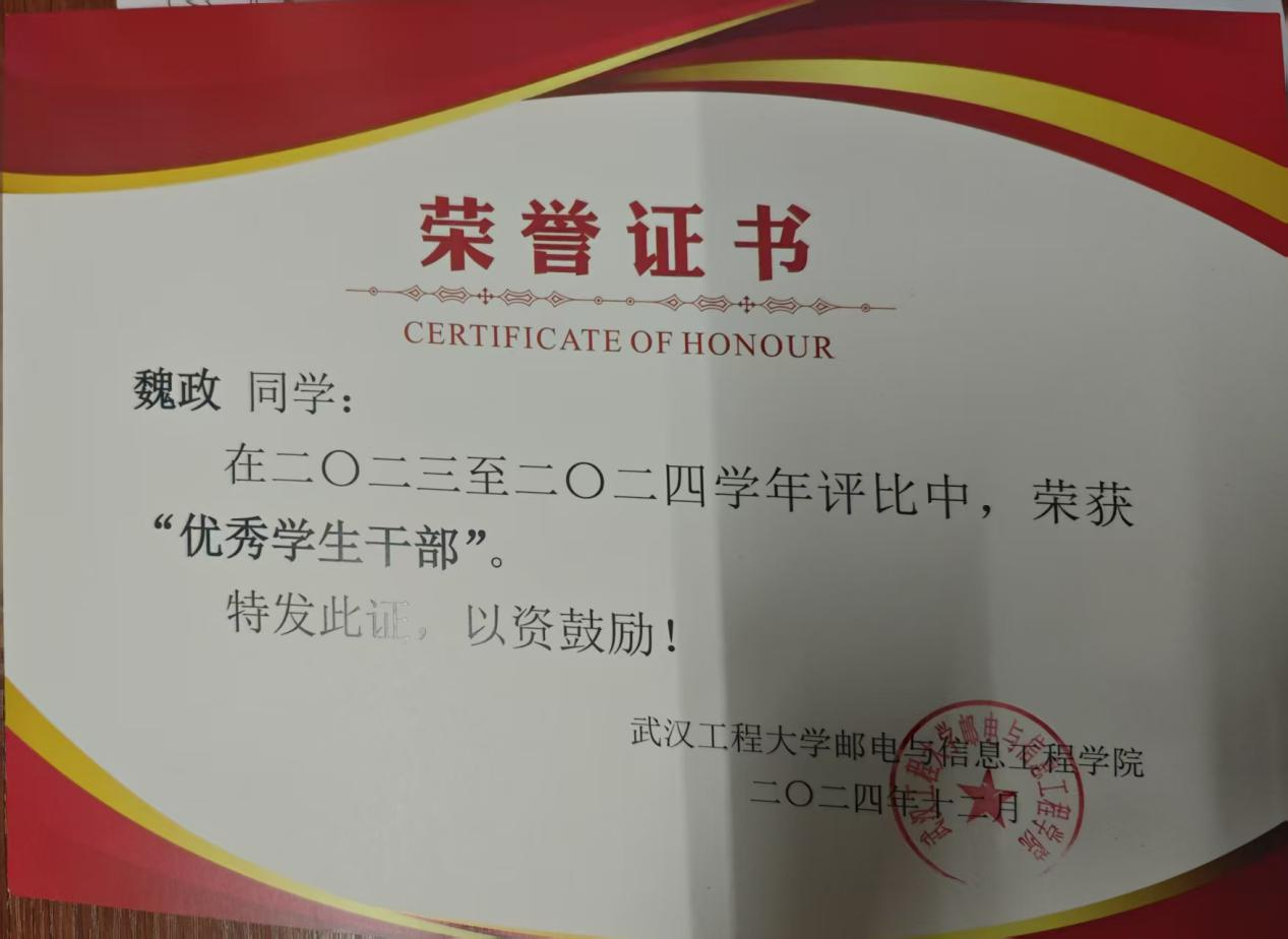 魏政,土家族,共青团员,机械与电气工程学院自动化(物联网方向)01班学生。现任学院学工助理团团长、就业促进协会会长、班级组织委员。在校期间表现突出,学业成绩优异,平均分达90分以上,累计38门课程中27门超90分,学习成绩与综测均位列专业第一。荣获国家励志奖学金、校级特等奖学金、甲等奖学金,获评“三好学生标兵”“优秀学生干部”“优秀共青团干”等荣誉称号。积极参与学科竞赛,获湖北省“挑战杯”铜奖、大学生创新大赛优秀奖;投身志愿服务,累计时长378小时,获“优秀暑期志愿者”“四二二先进个人”等表彰,并考取大学日语四级、计算机二级等多项技能证书。