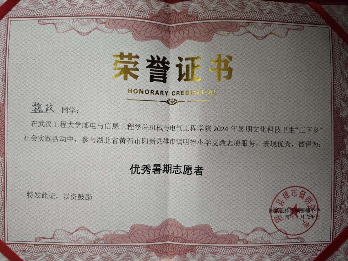 魏政坚信“实践是心灵的洗礼”,积极投身志愿服务与社会实践,累计服务时长378小时。他深入社区参与多项公益项目,在服务中体悟责任与奉献,获“优秀暑期志愿者”“四二二先进个人”等荣誉。通过实践,他将专业知识与社会需求紧密结合,展现了强烈的社会责任感和服务意识,以实际行动诠释了“励志成材、感恩同行”的青春内涵。