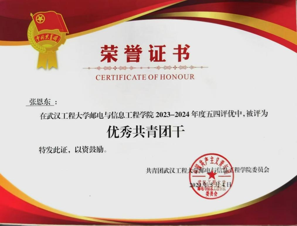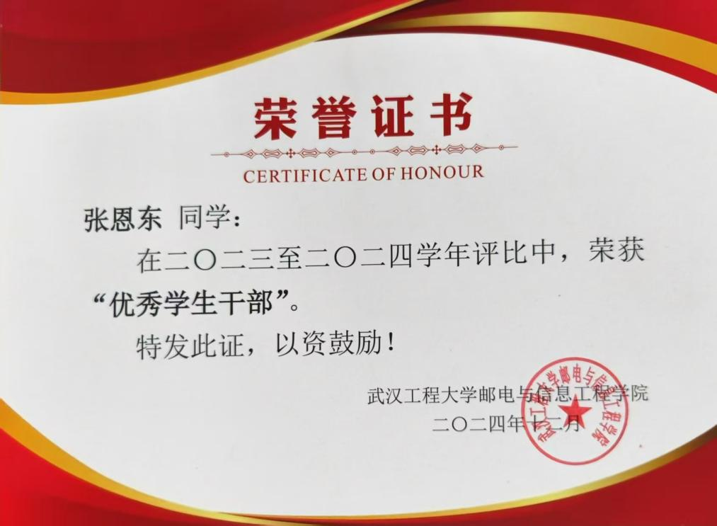 张恩东,共青团员,机械与电气工程学院2023级机械设计制造及其自动化(工业机器人方向)01班学生。曾任学院团总支学生会社会实践部副部长。在校期间表现优异,学业成绩突出,学年综测81.18分,专业成绩88.4分,均位列班级第一。荣获学校特等奖学金、丙等奖学金,获评“三好学生标兵”“优秀学生干部”“优秀共青团干”“暑期社会实践先进个人”“优秀青年志愿者”等多项荣誉称号。积极参与学科竞赛,获湖北省“挑战杯”大学生课外学术科技作品竞赛省级三等奖、中国国际大学生创新大赛校级优秀奖,累计志愿服务时长458小时,展现出全面发展的优秀素养。