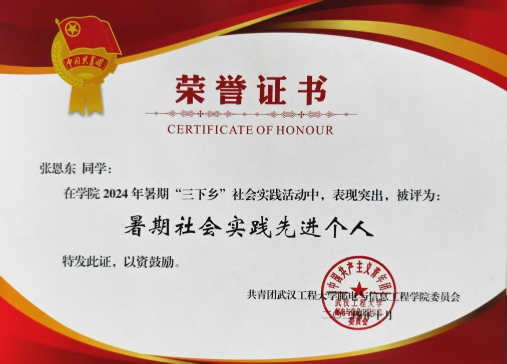作为社会实践部负责人,张恩东积极组织并参与多项校内外志愿服务活动,包括武昌区中央花园社区家电维修、八一社区便民服务登记、青山区青翠苑小学“科创赋能”共建活动等,累计服务时长458小时。通过持续的实践锻炼,他不仅提升了组织协调能力,更以真诚奉献赢得了广泛认可,生动诠释了“奉献、友爱、互助、进步”的志愿精神。