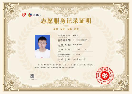 入团五年来,他始终以一名优秀共青团员的标准严格要求自己,积极向党组织靠拢,如今已是一名入党积极分子。他坚持在“学习强国”平台上汲取理论养分,累计积分高达8000分,不断夯实思想根基,提升政治素养。无论是在学习工作中,还是在志愿服务里,他都将理论学习成果转化为实际行动,以先锋模范的姿态带动身边人,践行着新时代青年的使命与担当。