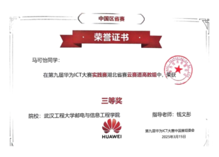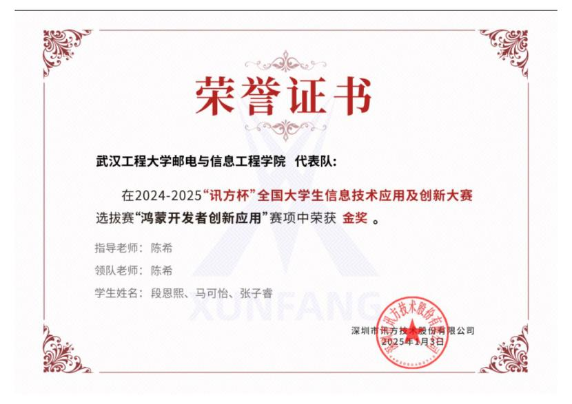 在物理实验创新领域,她凭借敏锐的观察力与扎实的实验功底,在 2025 年湖北省大学生物理实验创新设计竞赛中脱颖而出,荣获二等奖;在科技创新赛道,她与团队并肩作战,深耕课外学术科技项目,历经无数次打磨与完善,最终在 2025 年湖北省第十五届 “挑战杯” 大学生课外学术科技作品竞赛中斩获三等奖;在信息技术应用领域,她凭借过硬的专业技能,在 2025 年讯方杯全国大学生信息技术应用及创新大赛中勇夺金奖,充分展现了扎实的技术功底与创新能力。