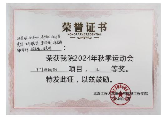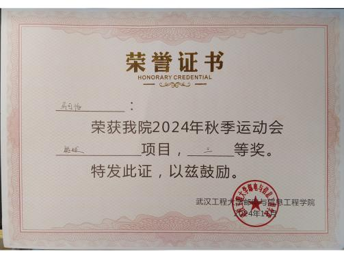 在 2024 年校运动会女子铅球项目中,她凭借顽强的毅力与出色的表现,荣获第三名;在 2023 年校运动会女子 8 字跳绳团体赛中,她与队友们默契配合、奋勇拼搏,最终夺得团体第一名的好成绩。赛场上,她展现出的拼搏精神与团队凝聚力,感染着身边的每一个人。