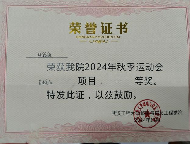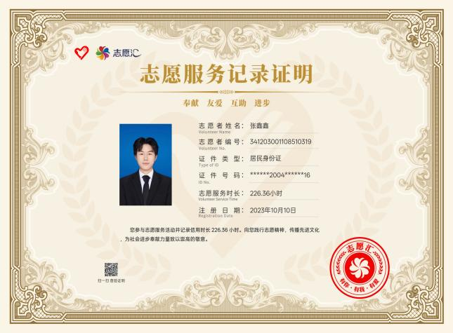 四、生活为歌,多元成长展风采 张鑫鑫始终坚信,青春应是多元且热烈的。他热爱生活,积极参与校园文体活动,在学院拉拉操比赛中挥洒汗水,展现团队协作的魅力;在学校运动会上,获得跳远二等奖、百米定向一等奖、八字跳绳一等奖、跳高三等奖等等,用运动诠释青春的活力。课外之余,他考取驾驶证,不断解锁生活新技能。同时,他热心志愿服务,积极参与就业促进协会的企业宣讲会服务、学院各类活动保障等志愿工作,累计志愿时长约230小时。在志愿服务中,他体会到奉献的快乐,也让自己的大学生活在服务他人、奉献集体中变得更加丰盈。
